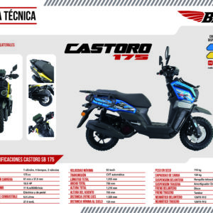 La Castoro 175 es una motoneta automática diseñada para quienes buscan potencia y versatilidad. Con un motor de 175 cc y una transmisión CVT, ofrece una conducción suave y eficiente. Su potencia de 10.8 HP y torque máximo de 11 Nm garantizan un desempeño confiable en cualquier terreno. Esta motoneta cuenta con protectores laterales, alarma y un puerto USB integrado, ideal para mantenerte conectado durante el viaje. Su diseño robusto y funcional la convierte en la compañera perfecta para el día a día o aventuras fuera de la ciudad.